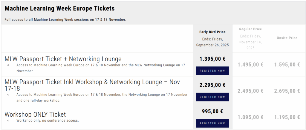 The program for Machine Learning Week Europe in Berlin this November is complete! Get your tickets by September 26th to take advantage of the 🐦 early-bird pricing 💸 for the conference and post-conference workshops.
