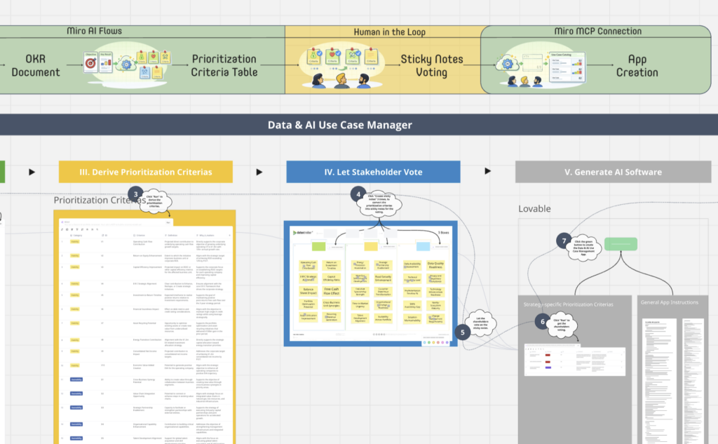 Two Miro competitions we participated in reveal a glimpse of the Data & AI Bench 2.0: the first was about demonstrating Miro AI Flows and the second was about using Miro’s MCP interface for vibe coding tools such as Lovable or Cursor. Our submission is an AI workflow that takes a custom strategy presentation and creates a tailored software app to manage data & AI use cases.