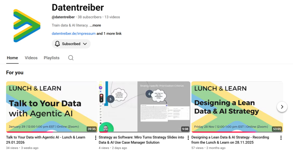 - Lunch & Learn, 12.03.2026, Zoom: Datentreibers Benjamin and Georg will show how you could create custom software from your strategy documents.